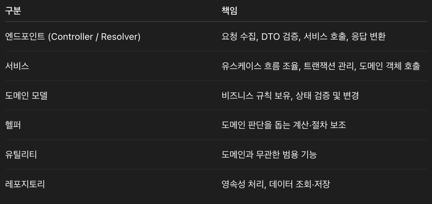 엔드포인트 클래스는 여전히 요청과 응답에만 집중한다. 서비스는 흐름을 조율하고 트랜잭션의 경계를 관리한다. 레포지토리는 영속성에 대한 책임만 진다. 그리고 그 사이에서 발생하는 비즈니스 규칙 자체는 가능한 한 도메인 객체 안으로 끌어들인다.
