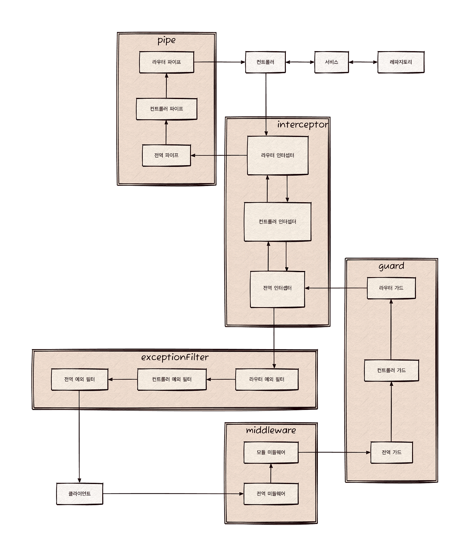미들웨어에 대해 알아보기 전에, 한 가지 짚고 넘어가야 할 개념이 있다. Nest.js 서버로 들어온 요청은 단순히 컨트롤러로 바로 전달되지 않는다. 앞서 살펴본 가드나 파이프뿐만 아니라, 미들웨어와 인터셉터 등을 거쳐 단계적으로 처리된 뒤 컨트롤러에 도달한다. 그리고 컨트롤러에서 처리된 결과는 다시 인터셉터와 예외 필터를 거쳐 클라이언트로 전달된다.