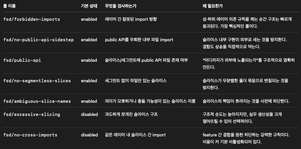 FSD(Feature-Sliced Design)는 프론트엔드 아키텍처를 장기적으로 유지하기에 매우 유용한 방법론이다. 레이어와 슬라이스를 명확히 구분하고 의존 방향을 제한함으로써, 프로젝트 규모가 커질수록 코드베이스의 복잡도를 구조적으로 통제할 수 있다. 다만 이 장점은 동시에 부담이 되기도 한다. 규칙이 명확한 만큼, 이를 사람의 기억과 자율에만 맡기기에는 구조적 제약이 상당히 크다.